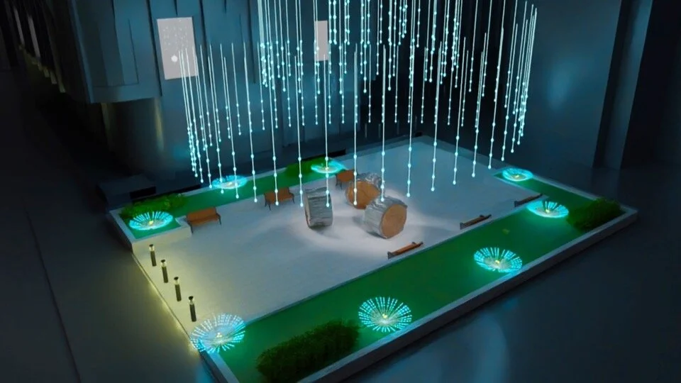 The canopy of the tree is the focus of the light installation where the branches are recreated in LED lights that are based on a golden spiral grid. The grid will be suspended on cables to support each hanging light branch. Each light reflecting the care and importance of the tree and the life it gives to urban based folks. This kind of care and comfort will be both inviting and spectacular from the ground or the building looking down. Trees carry histories of the space and provide protection for humans and animals; as we continue to construct more buildings in the physical space, it’s important for dense urban spaces to remember this symbiotic relationship, the growth of support of the willow tree and historical routes in the Toronto area.
